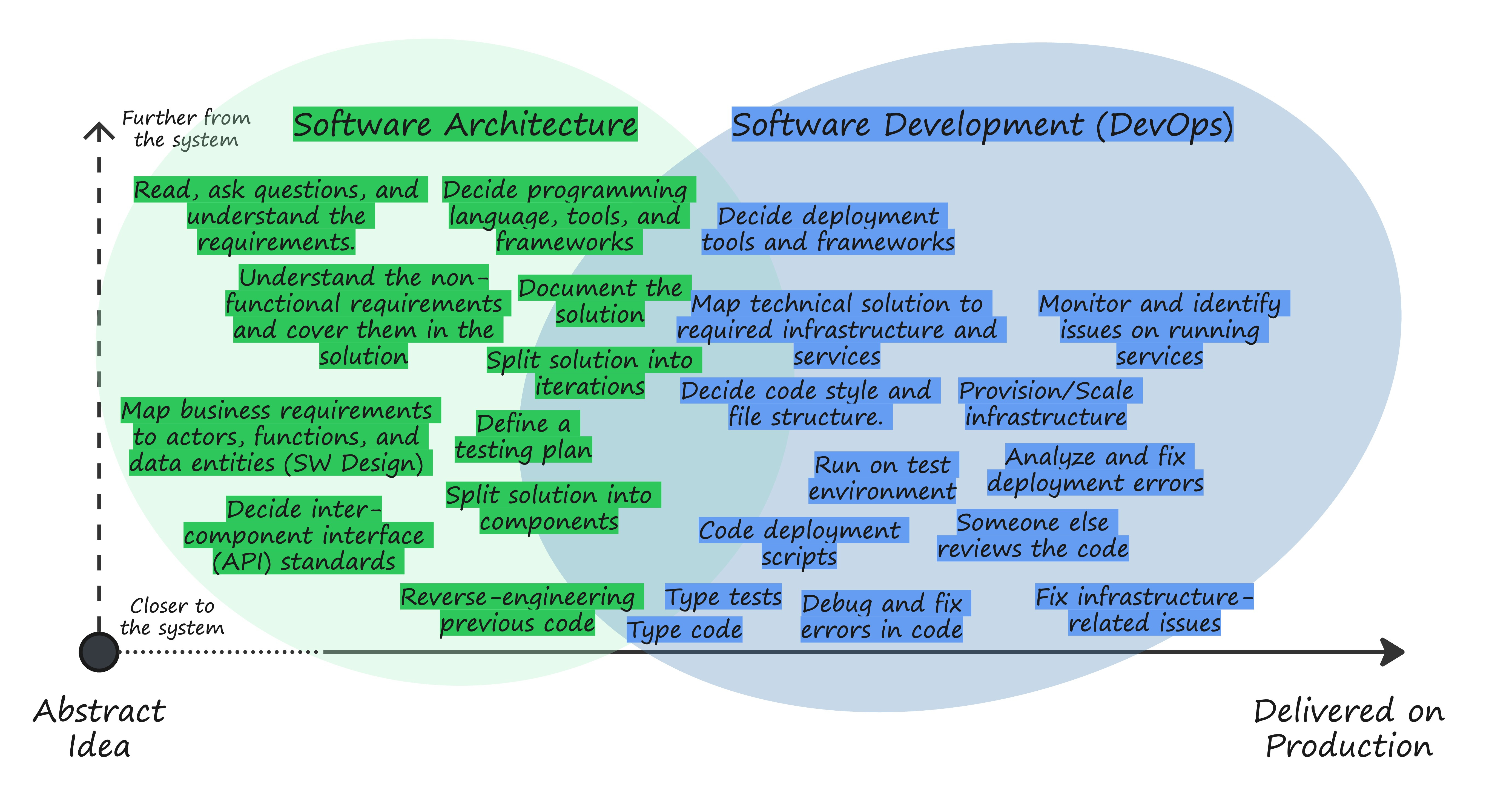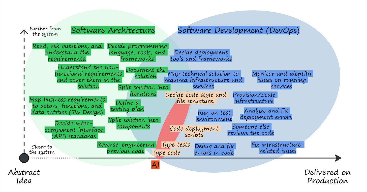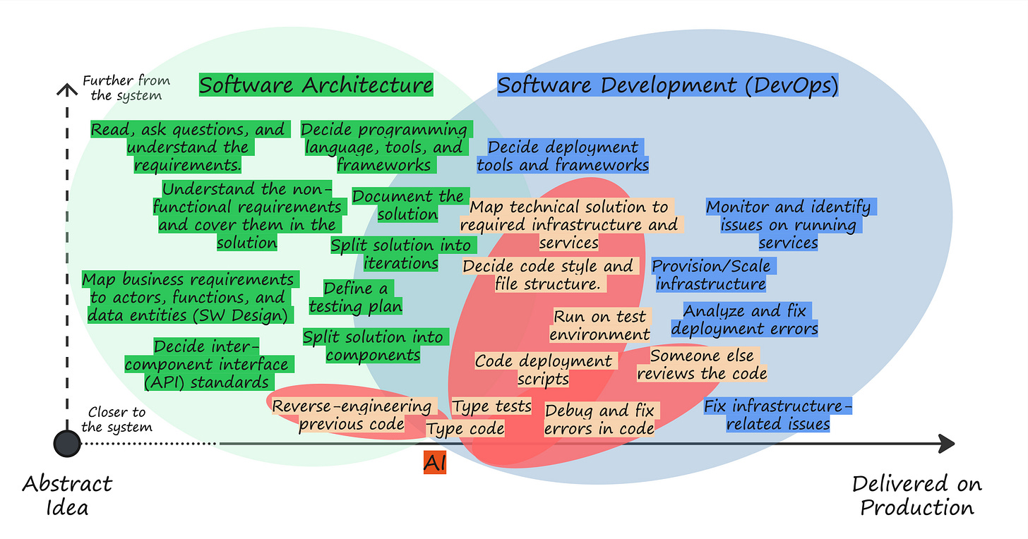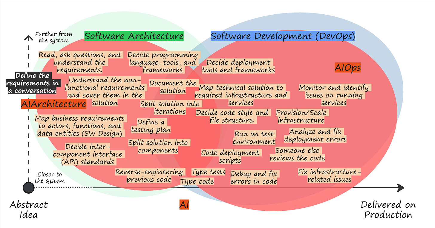 On the left side, the promise that AI can absorb software architecture. This becomes much simpler once AI can handle operations smoothly for the code it produces. Why would that make architecture simpler? Because nobody cares if the AI is creating spaghetti code, a horrible monolith, or two thousand microservices as long as they don’t need to modify or even see the code, and it’s not impacting costs. All functions that were required due to human-related constraints are gone. Splitting into components to reduce cognitive load? Scratch that if the AI can model the whole domain at once. Document the solution? I’m fine with a black box. API modeling? I can disregard internal ones and focus on those that interface with external systems.