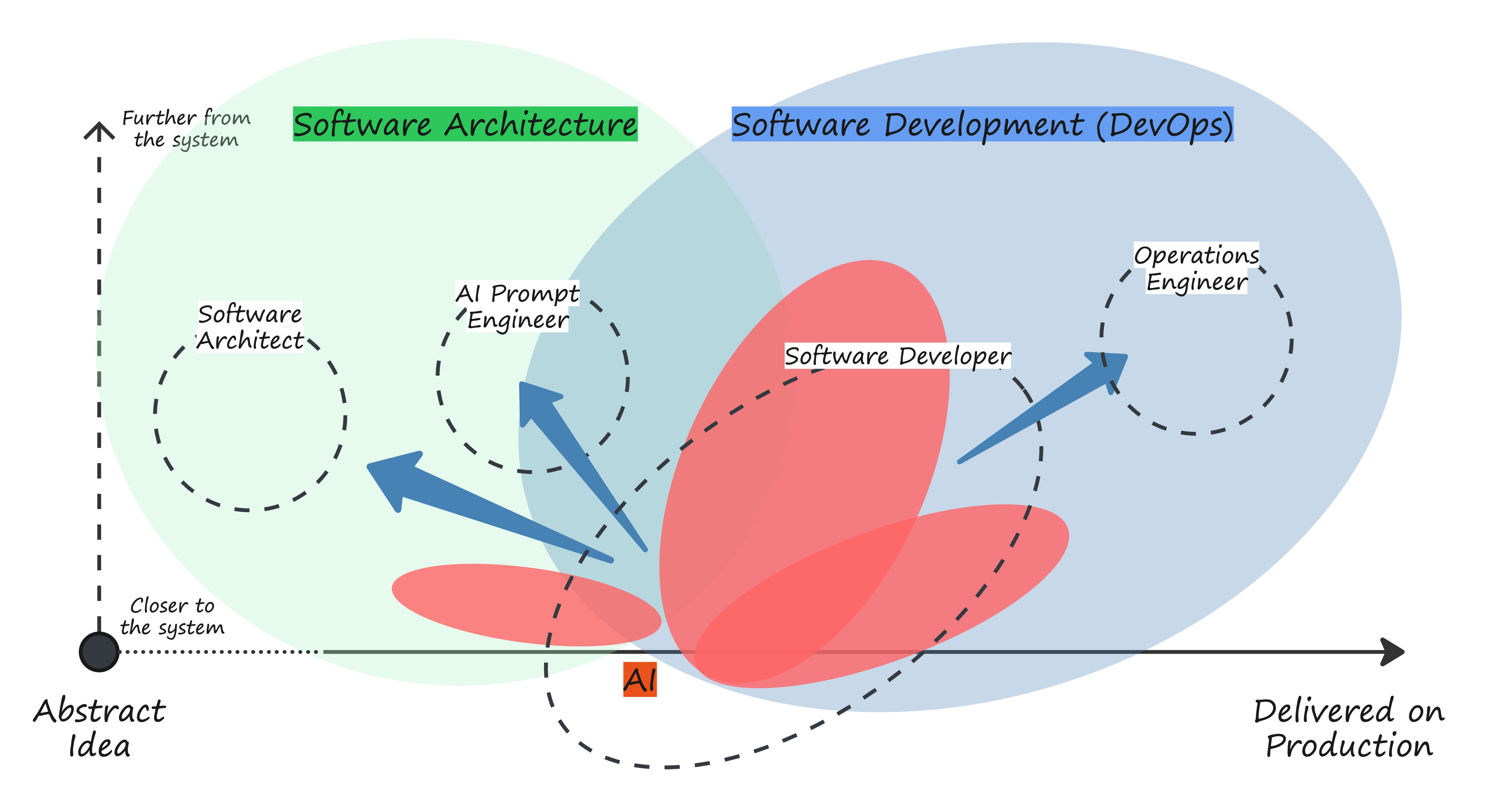 One of the most significant impacts of this approach is that AI is redefining some classic organizational roles. A new function arises: “Guiding, Testing, and Refining the AI-generated source code,” and new roles with fancy names are created around that, e.g., AI (Prompt) Engineer. Additionally, software developers can start contributing more to software design and architecture, or shift to the right side of the spectrum, focusing more on operations.