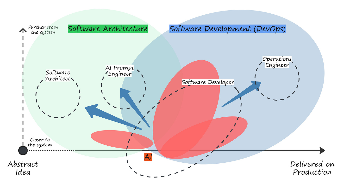 The boundaries of functions covered by AI remain within the technical realm of software architecture and development, which means that technical professionals (developers, architects, and new role names) are the ones operating AI in this context.